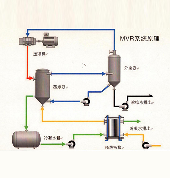MVR管式降膜蒸發(fā)器是將料液自降膜蒸發(fā)器加熱室頂部管箱加入,經(jīng)特殊布膜裝置均勻分布到各換熱管內(nèi),并沿?fù)Q熱管內(nèi)壁呈均勻膜狀流下,在下流過(guò)程中,被殼程加熱介質(zhì)加熱汽化,產(chǎn)生的蒸汽與液相共同進(jìn)入蒸發(fā)器的分離室,汽液經(jīng)充分分離后,蒸汽進(jìn)入冷凝器冷凝或進(jìn)入下一效蒸發(fā)器作為加熱介質(zhì),從而實(shí)現(xiàn)多效操作;二次蒸汽也可以經(jīng)壓縮機(jī)壓縮升壓升溫后重新返回加熱室,從而實(shí)現(xiàn)MVR蒸發(fā)操作;濃縮液則從分離室排出。降膜蒸發(fā)器可根據(jù)被濃縮的物料性質(zhì)與自然循環(huán)蒸發(fā)器、強(qiáng)制循環(huán)蒸發(fā)器、蒸發(fā)結(jié)晶器等組合使用。